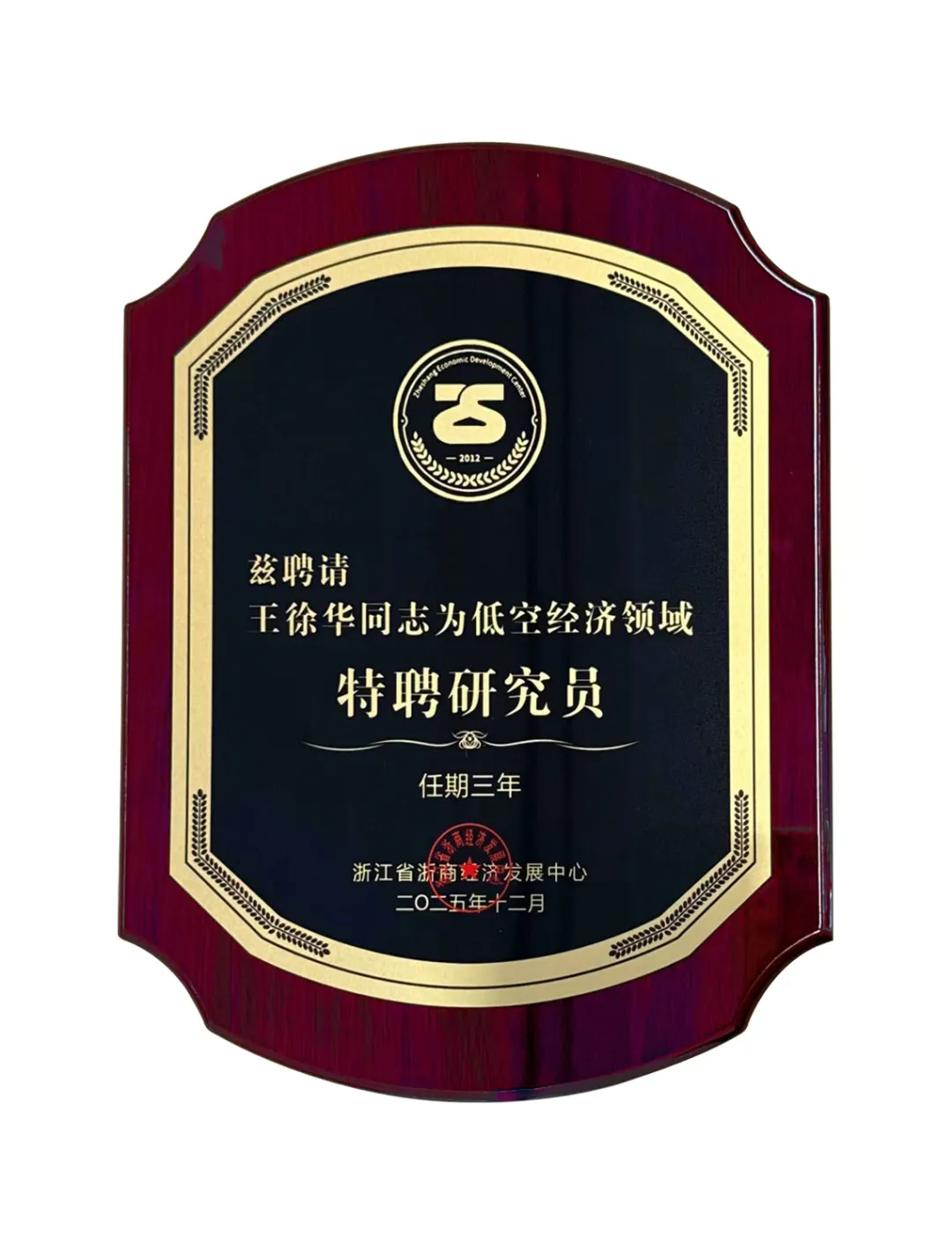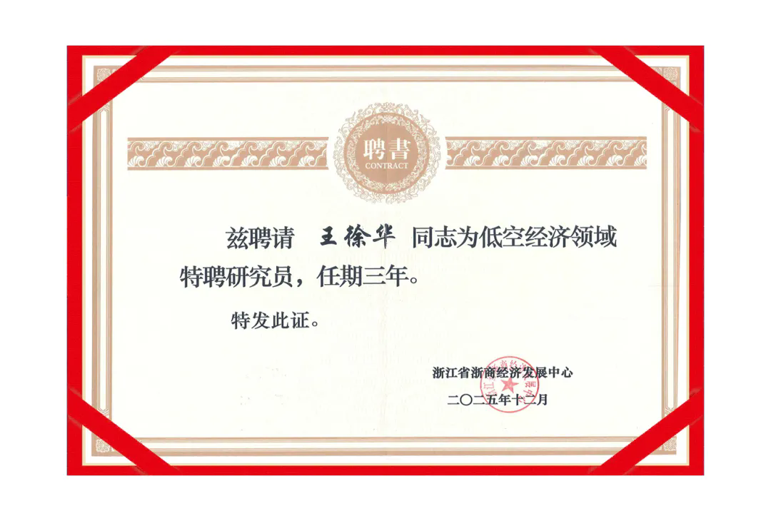 作为由浙江省经济和信息化厅主管、原副省长龙安定曾任主任的权威机构,浙江省浙商经济发展中心此次选聘聚焦 “有影响力的企业家与专家学者”,旨在构建浙商经济发展智库核心力量。根据聘书职责,王徐华董事长将深度参与浙江省低空经济规划研讨、技术创新建言、产学研资源整合等关键工作,为这一 “新质生产力代表领域” 注入实战视角。